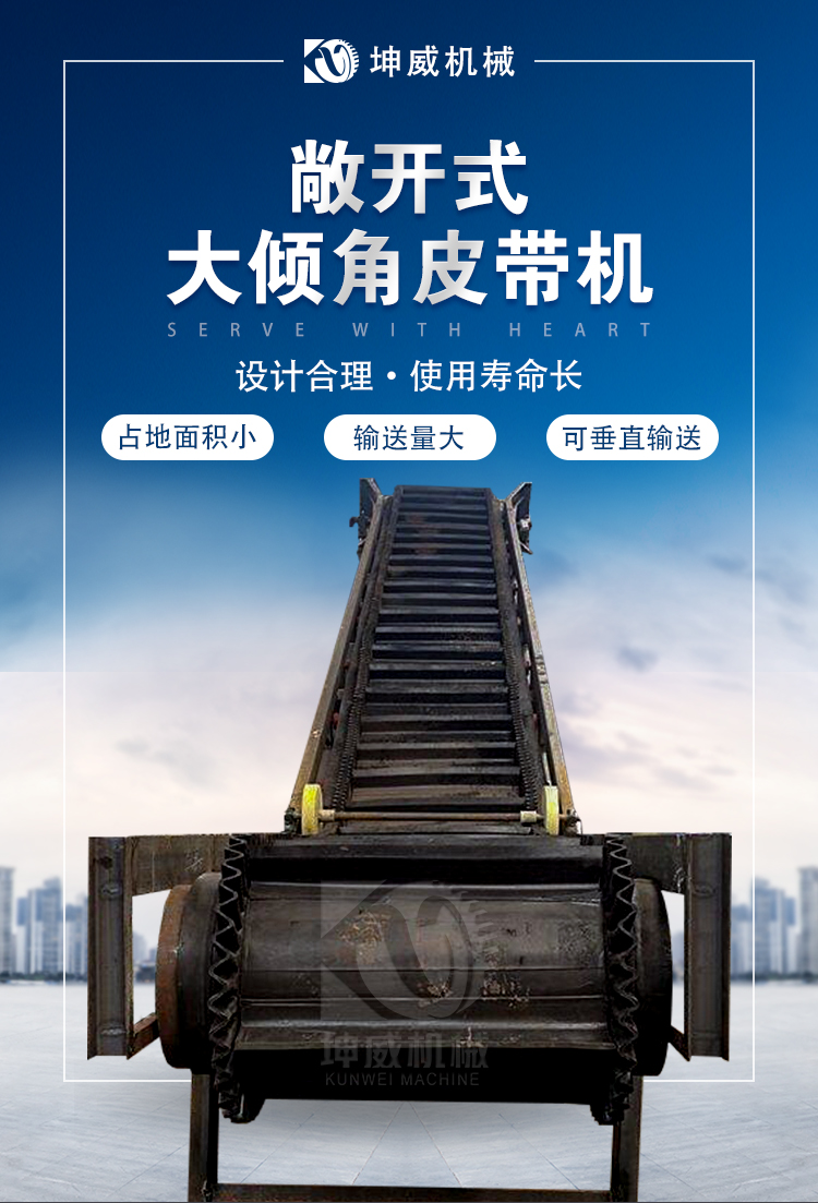 先說一下大 傾角帶式輸送機 的優(yōu)勢 (1)大傾角帶式輸送機的輸送傾角大,可達90,是大傾角輸送和垂直提升的理想設備。因此可以節(jié)約占地面積,節(jié)省設備投資和土建費用,取得良好